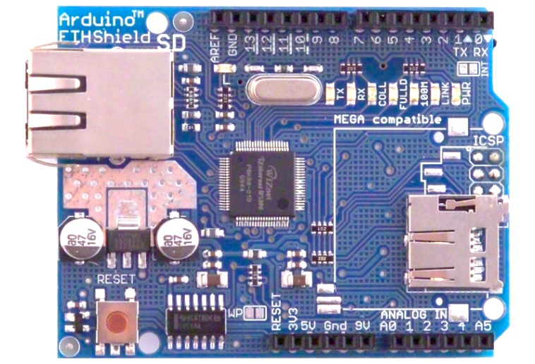 Este shield permite conectar Arduino a Internet. Está basado en el chip de ethernet Wiznet W5100 con funcionalidades de IP tanto para TCP como UDP. El Arduino Ethernet Shield soporta hasta 4 conexiones simultáneas. Utiliza la librería Ethernet para escribir rápidamente programas que se conecten a Internet empleando este shield.